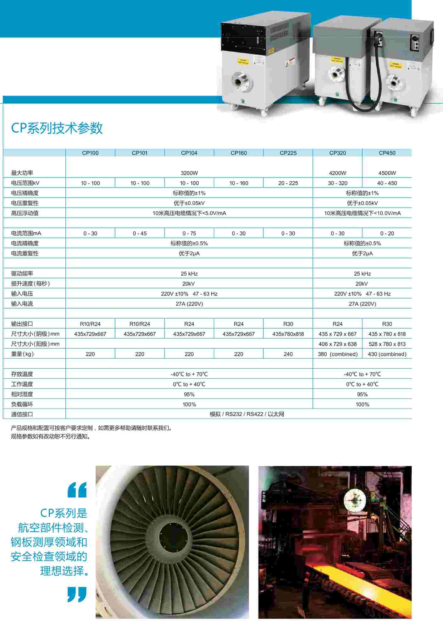 高美公司的CP系列射線機整合了較寬范圍的X射線功率和能量頻譜,成為特有的射線機。輸出功率最高到4500W。CP高壓射線機可匹配50kv-450kv輸出電壓的管頭,大功率的CP射線機可以滿足高劑量曝光的應(yīng)用需求。