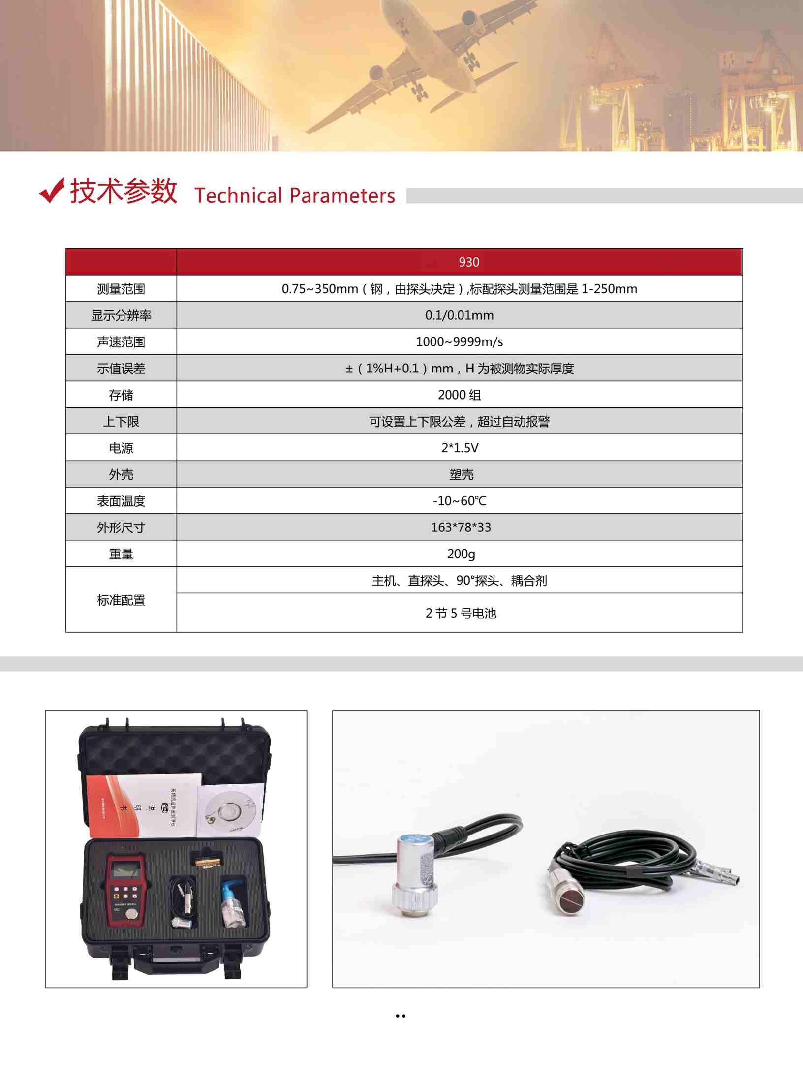 主機(jī)、直探頭、90°探頭、電池、耦合劑 |