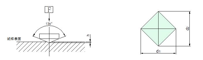 維氏硬度試驗是用136°正菱形金剛石壓頭,以規(guī)定試驗力(F)壓入被測試物體的表面,經(jīng)規(guī)定的保持試驗力時間后,卸除試驗力,用測微目鏡測量試件表面的壓痕對角線(d),計算壓痕的錐形表面積所承受的平均壓力(N/mm2),即維氏硬度值。(詳見圖1.1)。