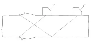 1.2.2 焊角回波在示波屏上回波位置所代表的深度和水平距離與焊角位置基本相同。一般情況下,1次波發(fā)現(xiàn)的焊角回波深度應(yīng)等于或稍大于2倍母材厚度T, 焊趾裂紋和咬邊反射的深度則符合下式:1 次波時: h≤T; 2 次波時: h≤2T。但由于儀器調(diào)節(jié)誤差、檢測誤差等原因, 或由于母材厚度減薄、對口錯邊、不等厚板對接等原因, 焊角回波深度也可能小于母材厚度, 此時易與缺陷波相混淆, 應(yīng)結(jié)合焊縫實際結(jié)構(gòu)仔細(xì)檢測判別。