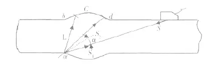 如圖4 所示, 當(dāng)超聲波主聲速方向與焊角處輪廓法線方向之夾角α小于第三臨界角αⅢ時, 界面處除反射1 個橫波S2 外, 還會產(chǎn)生1 個變型縱波L。當(dāng)α遠(yuǎn)小于αⅢ時, 變型縱波L 會射至c、b 等處, 相應(yīng)地, 反射橫波S2 會射至c、d 等處, 這些地方的輪廓法線方向與聲波入射方向相同或相近, 因此會在示波屏上產(chǎn)生2 個反射回波, 即L 與S2。另外, 由于α較小, 入射聲速S 的一部分會直接由焊角處返回探頭, 形成焊角回波S1。這樣, S1、S2 與L 波形成1 個如漢字“山”形的回波群, 故稱“山形回波”。