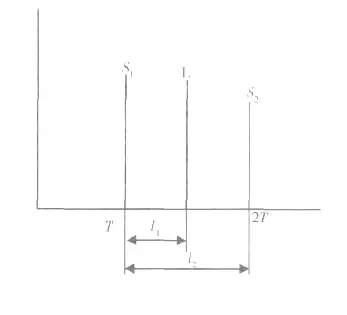 2.2.1 如圖4 所示, “山形回波”中L 波與S2 波聲程相近, 但L 波為變型縱波, 而縱波聲速遠(yuǎn)大于橫波聲速, 所以在熒屏上L 波落在S2 波之前。以鋼焊縫為例, 其縱波聲速CL=5 900 m/s, 橫波聲速CS=3 230 m/s, 設(shè)L 波與S2 波聲程相等, 則l1/l2=CS/CL=0.55(l1、l2 見圖5), 即在熒光屏上, L 波位于S1 與S2 波之間距的0.55 倍處( 與S1 的距離) 。而S2 波在熒屏上的具體位置則與定位方法有關(guān)。設(shè)S2 波的實際聲程為SⅡ, 則: