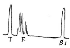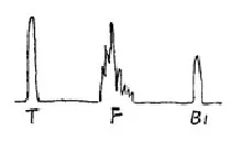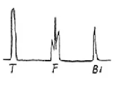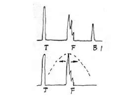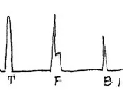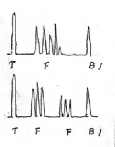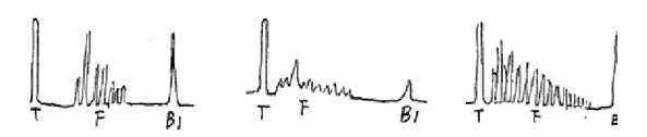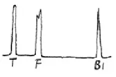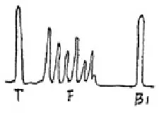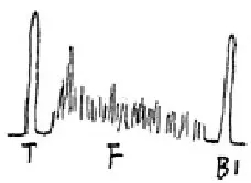 軸類鍛件中的縱向內(nèi)裂,直探頭圓周探傷,聲束平行于裂紋時(shí),既無底波也無傷波,當(dāng)探頭轉(zhuǎn)動(dòng)90°時(shí)反射波最強(qiáng),呈現(xiàn)裂紋波形,有時(shí)會(huì)出現(xiàn)裂紋的二次反射,一般無底波。底波與傷波出現(xiàn)特殊的變化規(guī)律(如圖)。