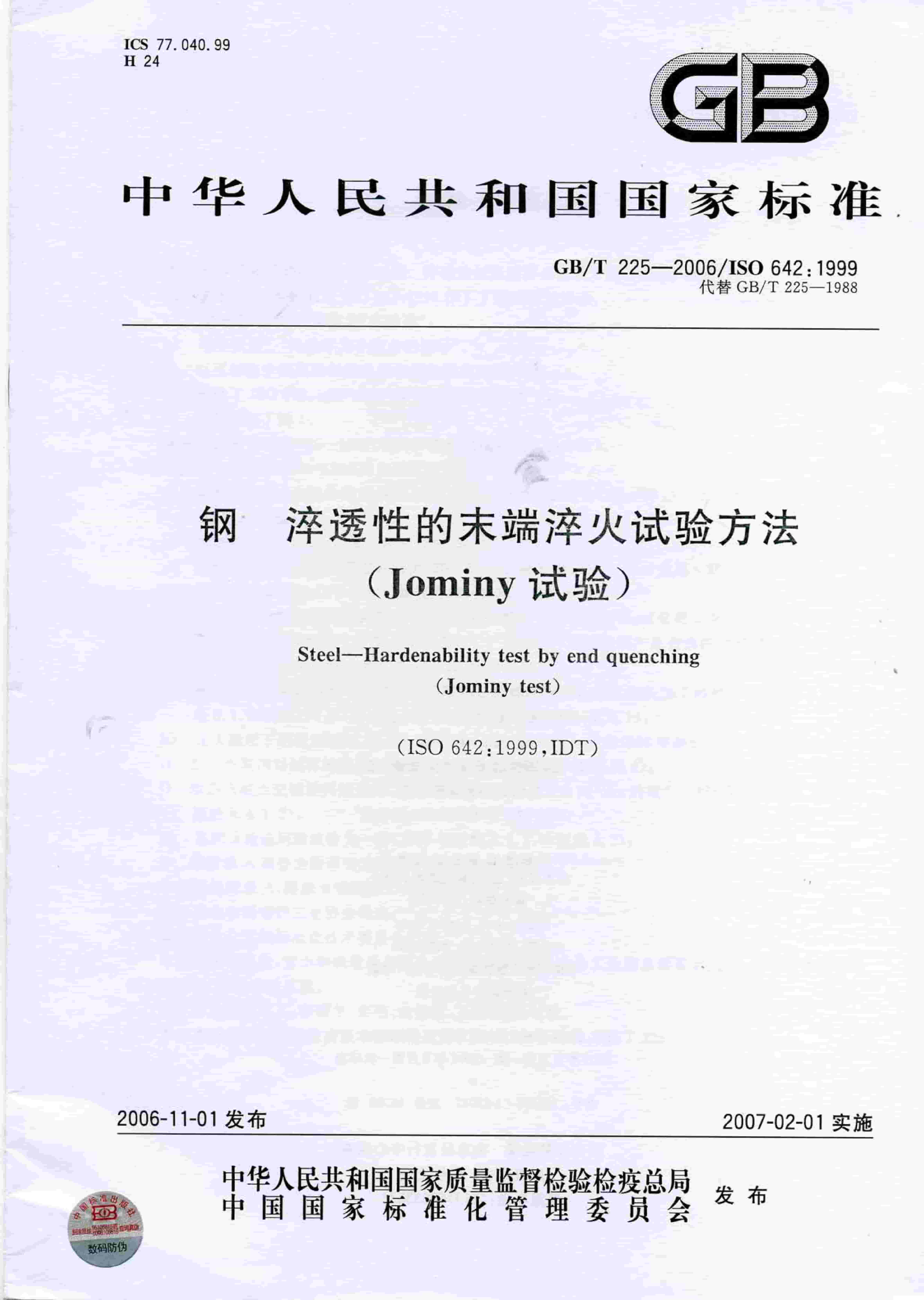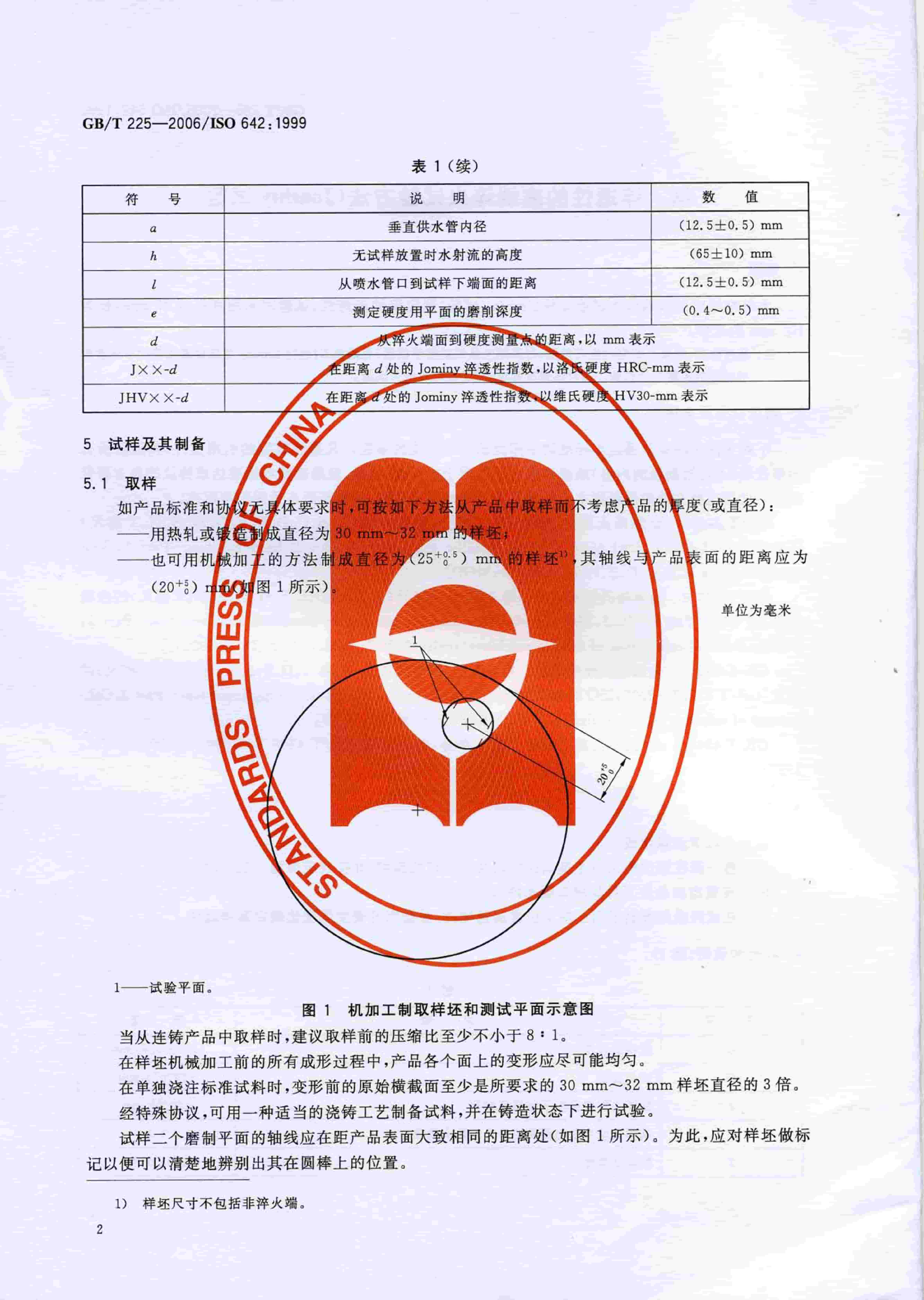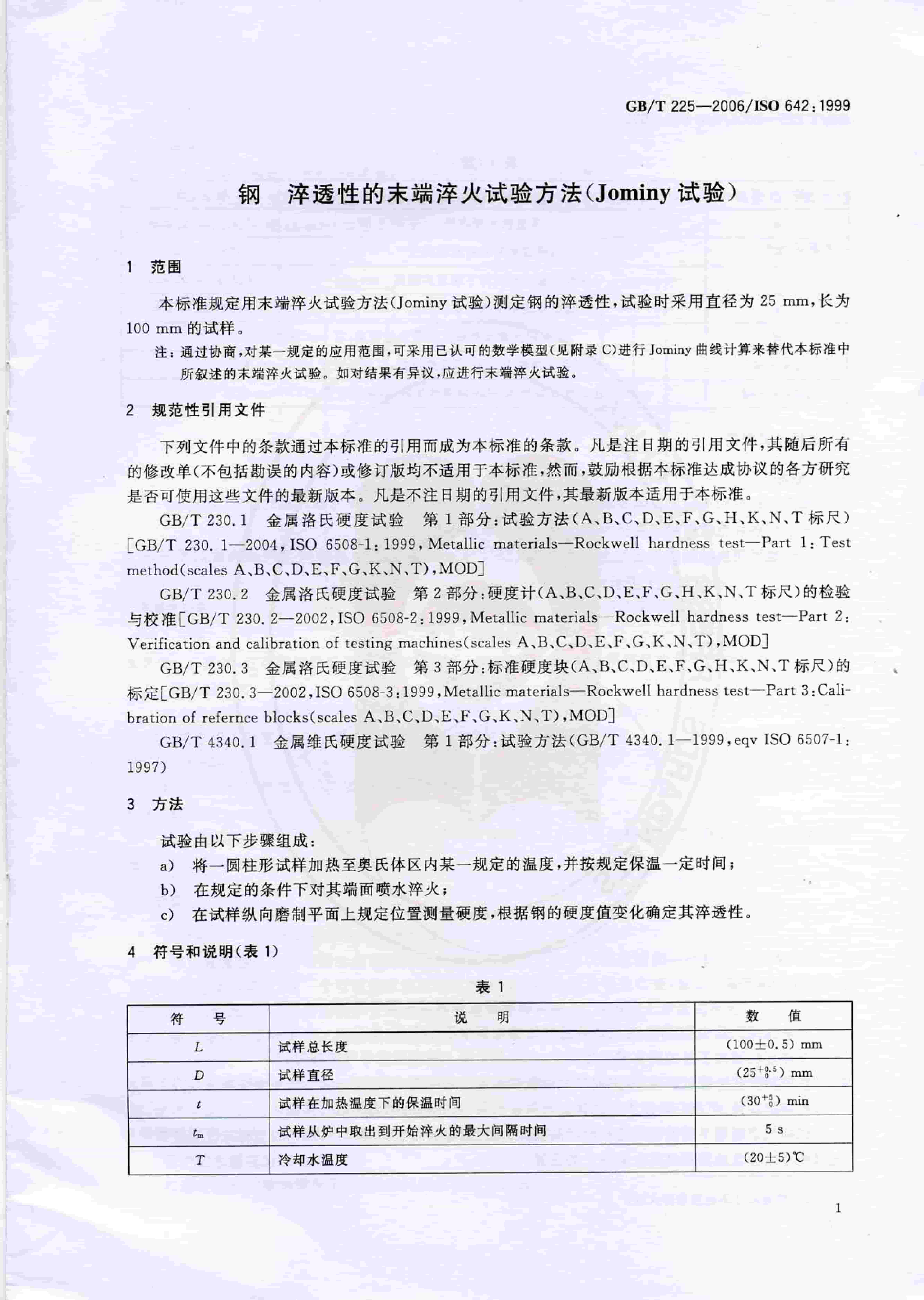 GBT 225-2006 鋼 淬透性的末端淬火試驗方法(Jominy 試驗)